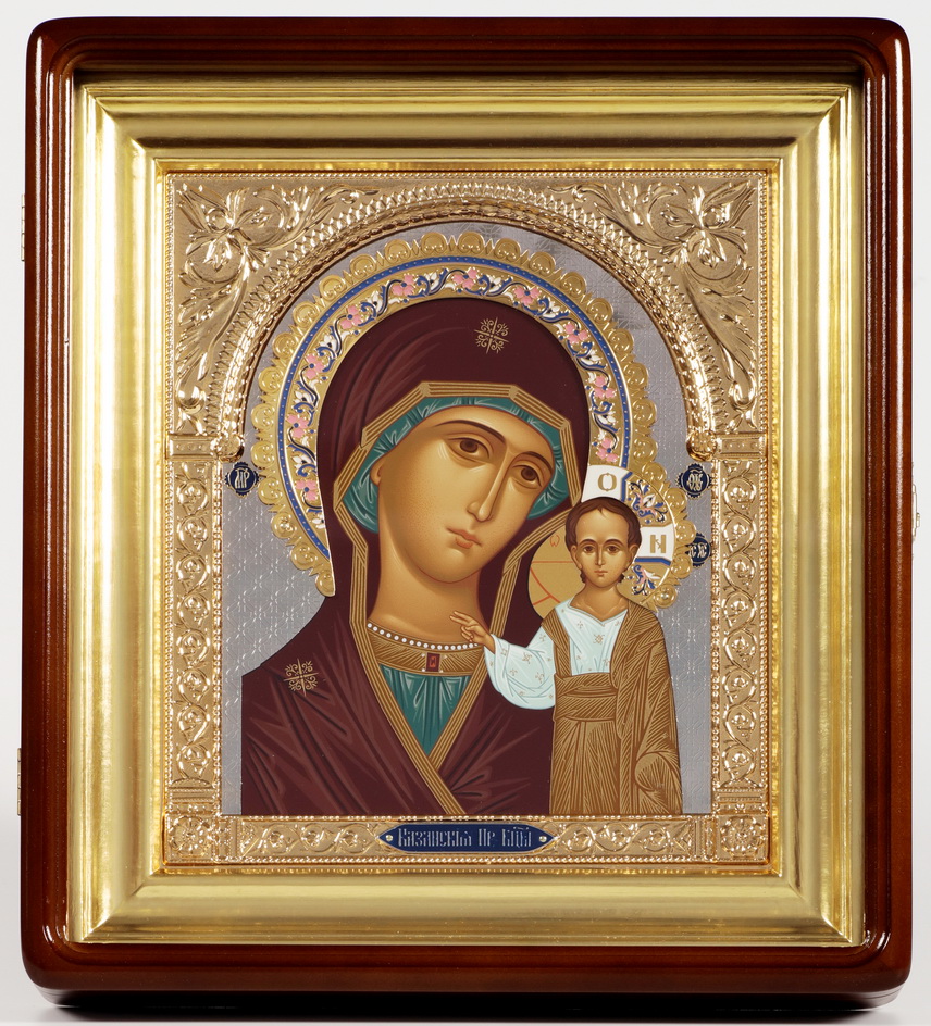 Икона живописная в киоте 24х30 темпера, риза открытая, никель, эмаль, киот №1 Казанская БМ