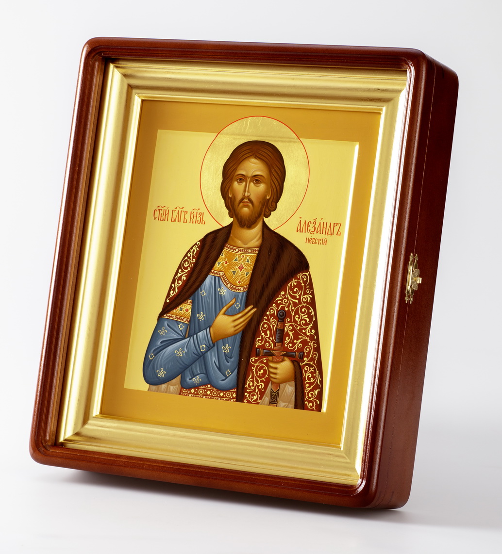 Икона живописная на доске в киоте 24х30 темпера, золоченый нимб, ковчег, киот №1 Александр Невский 1