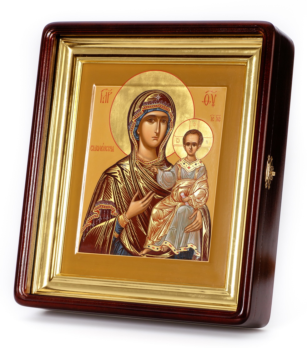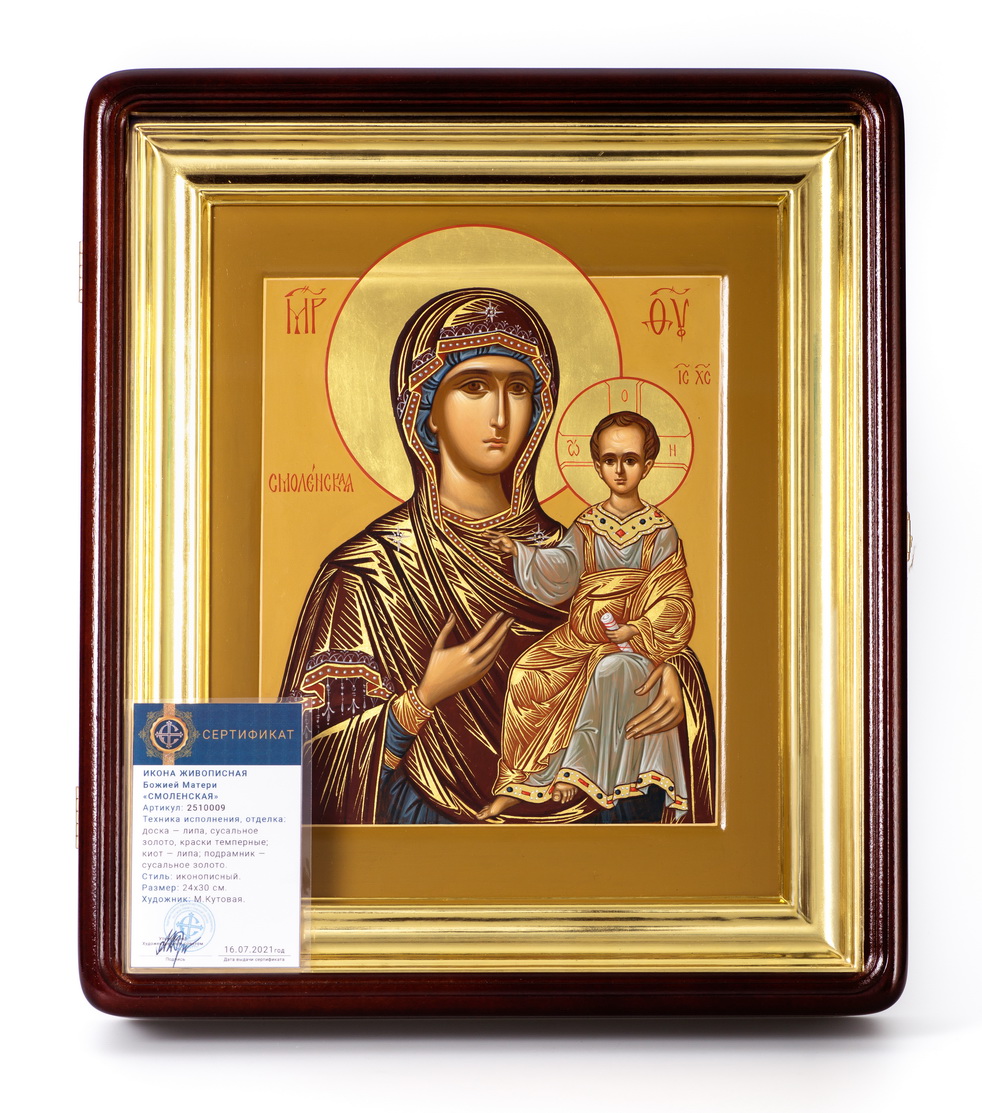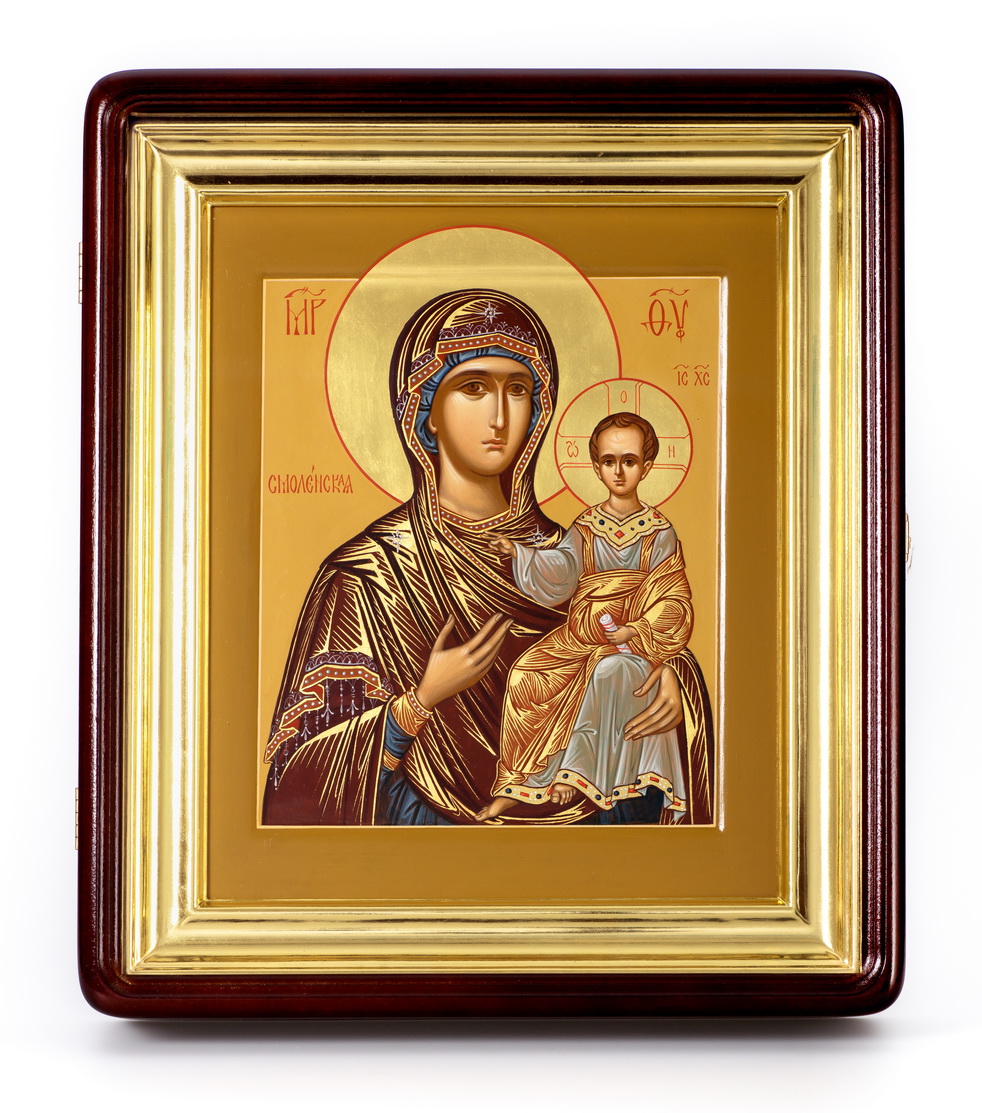 Икона живописная на доске в киоте 24х30 темпера, золоченый нимб, ковчег, киот №1 Смоленская БМ
