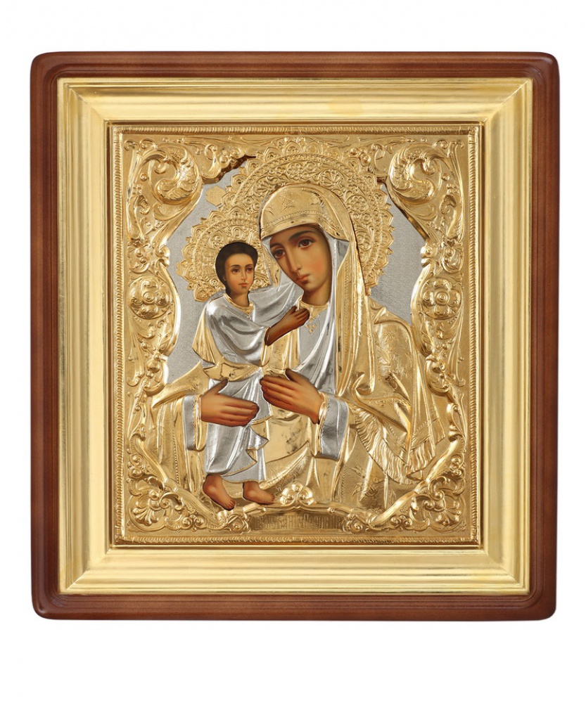 Риза изготавливается методом гальванопластики. В связи с техпроцессом габариты и вес изделия могут отличаться. Икона написана на МДФ покрытой левкасом. Риза изготовлена из меди, покрыта никелем и гальваническим золотом (комбинированное золочение).