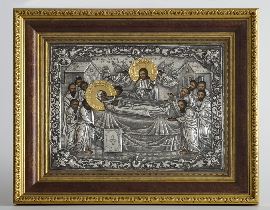Икона живописная в киоте 30х40 масло, риза №115, черненое серебрение, киот №22 Успение Богородицы
