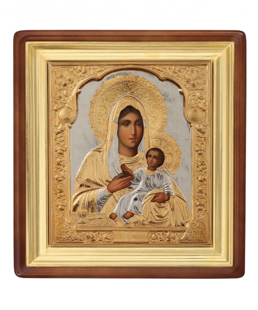 Риза изготавливается методом гальванопластики. В связи с техпроцессом габариты и вес изделия могут отличаться. Икона написана на МДФ покрытой левкасом. Риза изготовлена из меди, покрыта никелем и гальваническим золотом (комбинированное золочение).