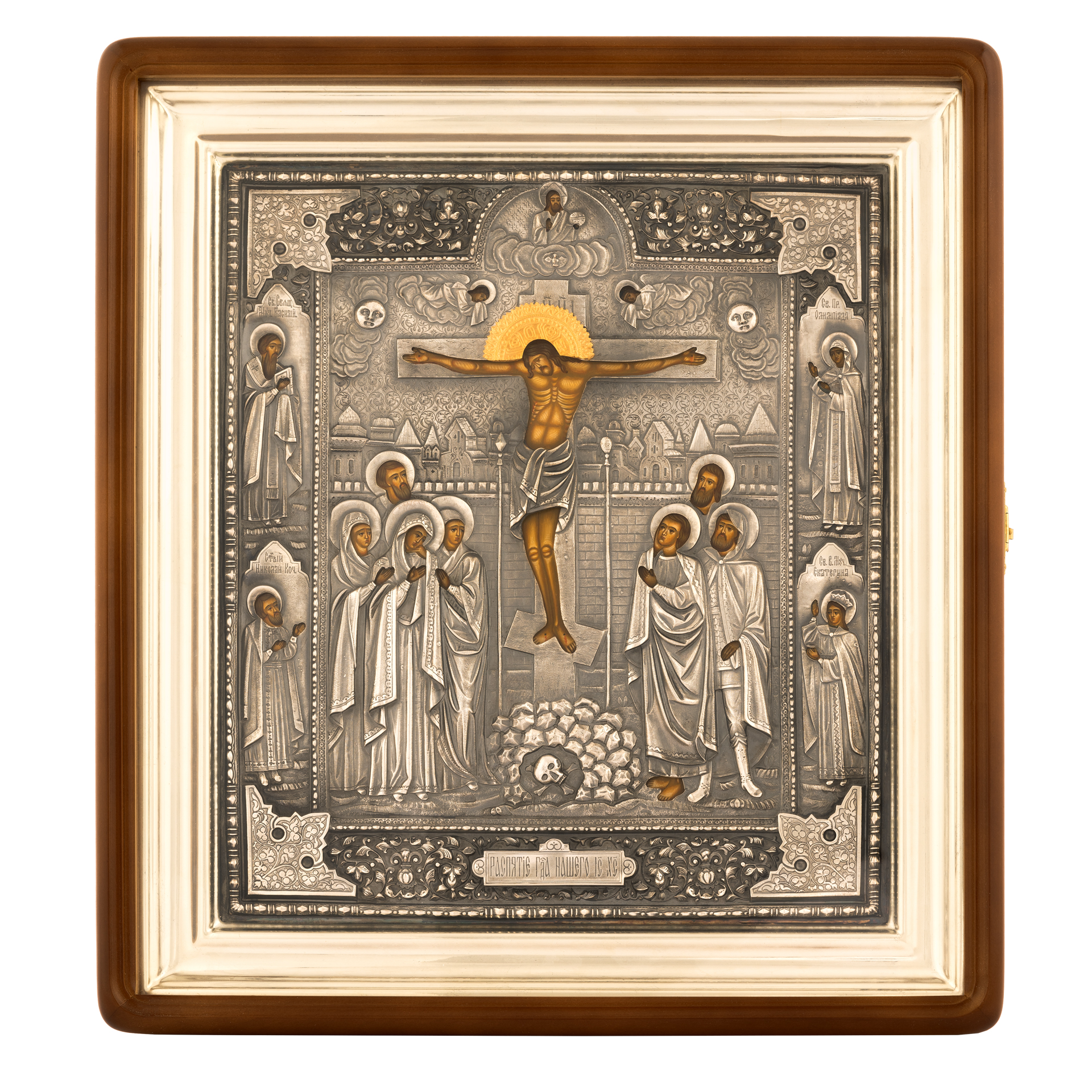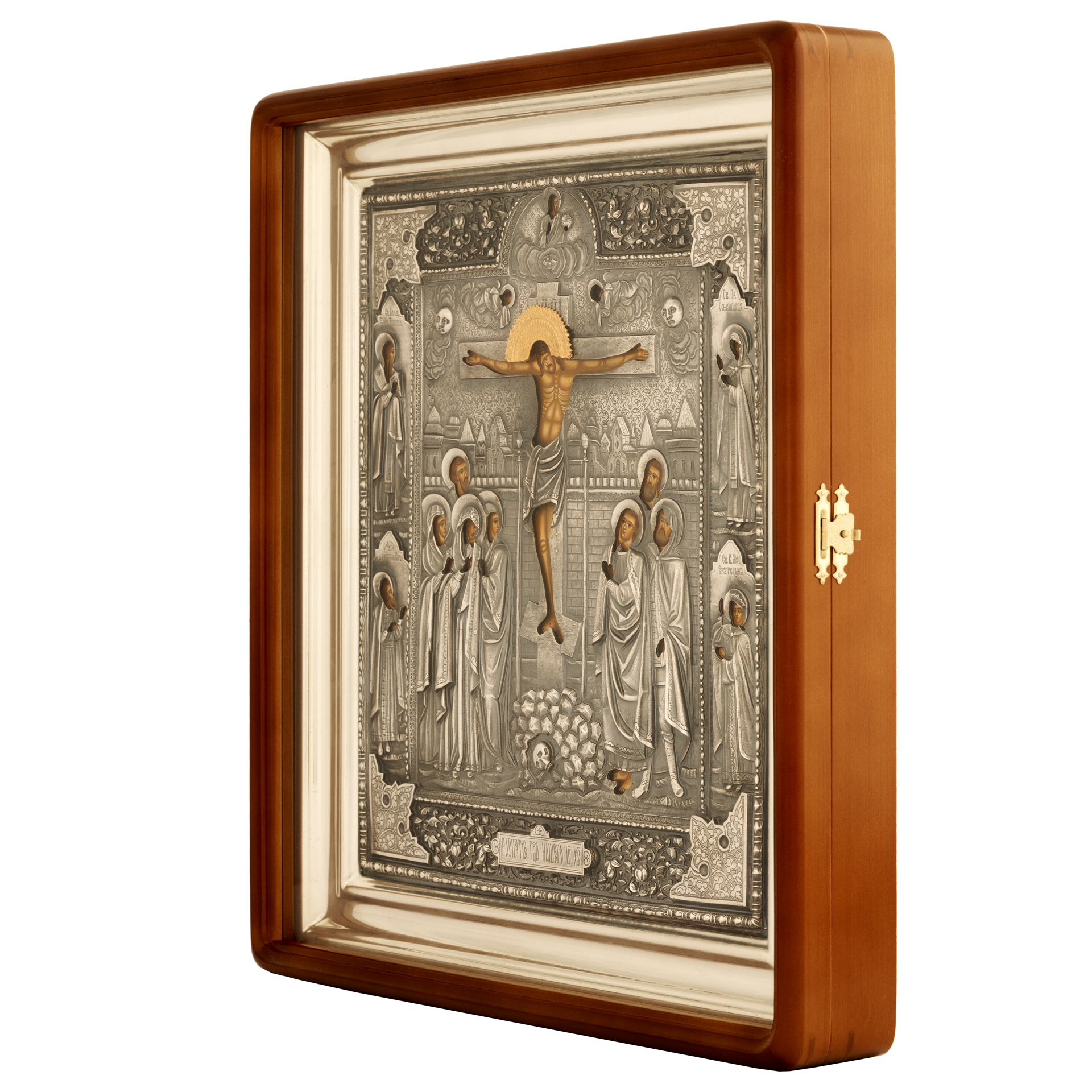 Икона живописная в киоте 30х40 масло, риза №90, черненое серебрение, киот №1 Распятие