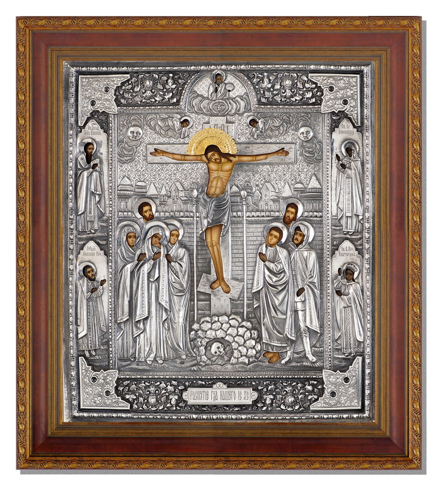 Икона живописная в киоте 30х40 масло, риза №90, черненое серебрение, киот №22 Распятие