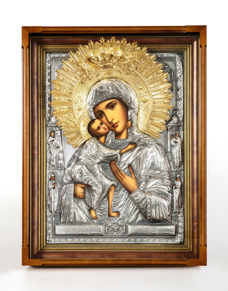 Икона живописная в киоте 50х70 масло, риза №144, черненое серебрение, киот №21 Феодоровская БМ