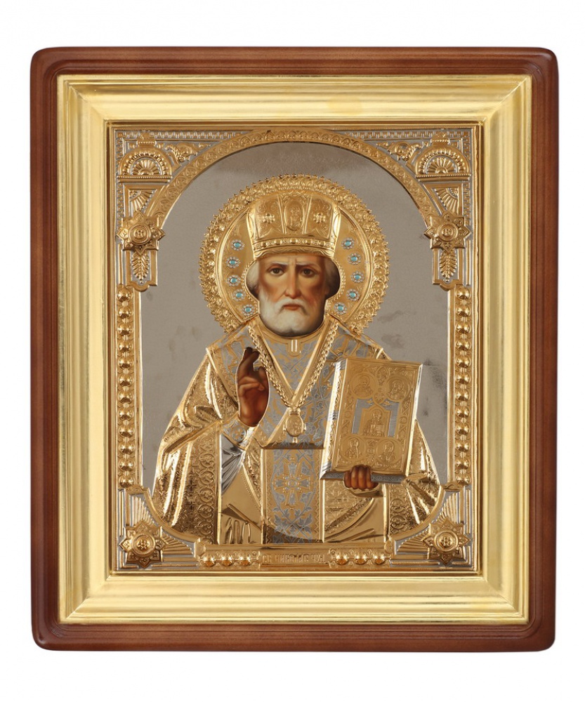 Риза изготавливается методом гальванопластики. В связи с техпроцессом габариты и вес изделия могут отличаться. Икона написана на МДФ покрытой левкасом. Риза изготовлена из меди, покрыта никелем и гальваническим золотом (комбинированное золочение).