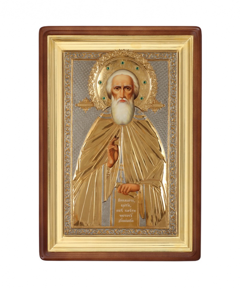 Икона живописная в киоте 60х90 масло, риза №201, эмаль, стразы, киот №1 Сергий Радонежский