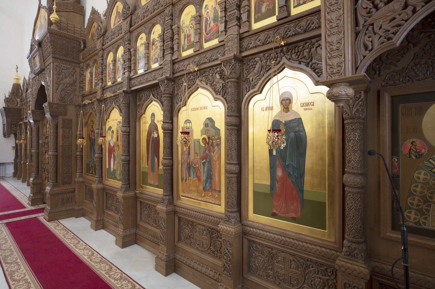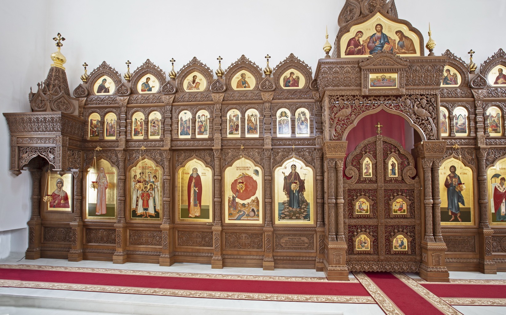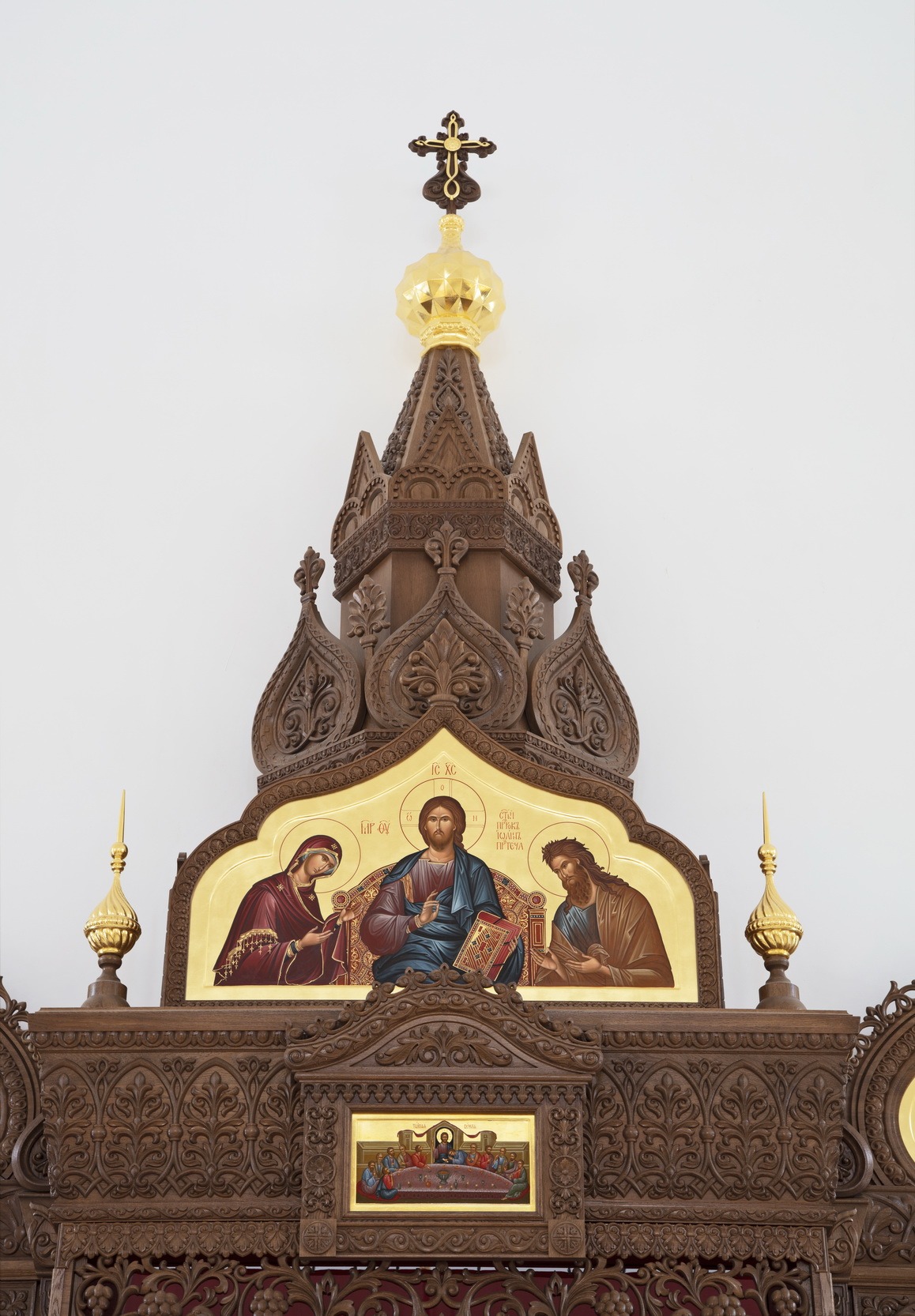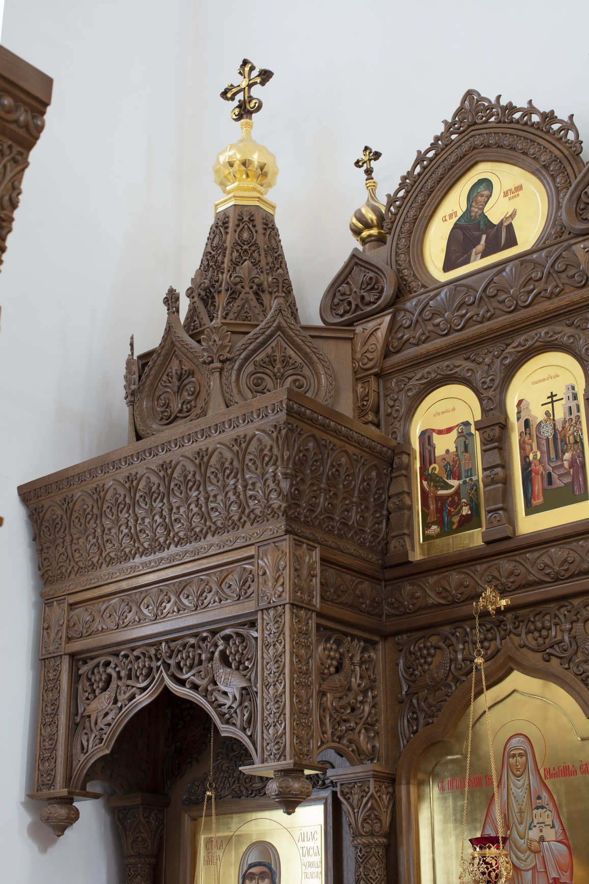 Иконостас №593 резной, дубовый, с частичным золочением, иконы живописные с золоченым фоном