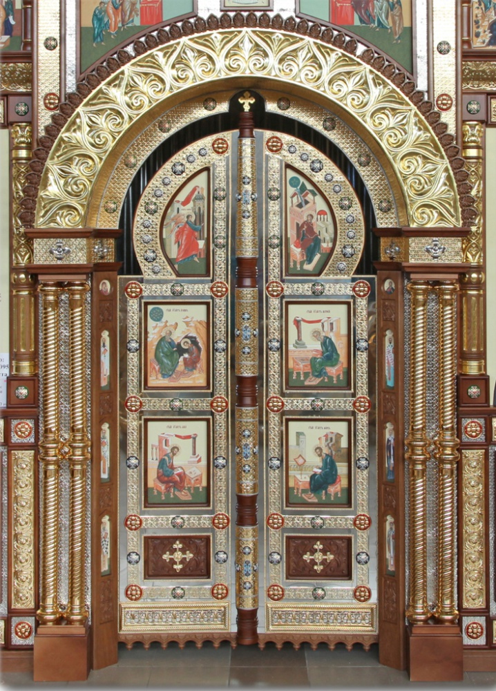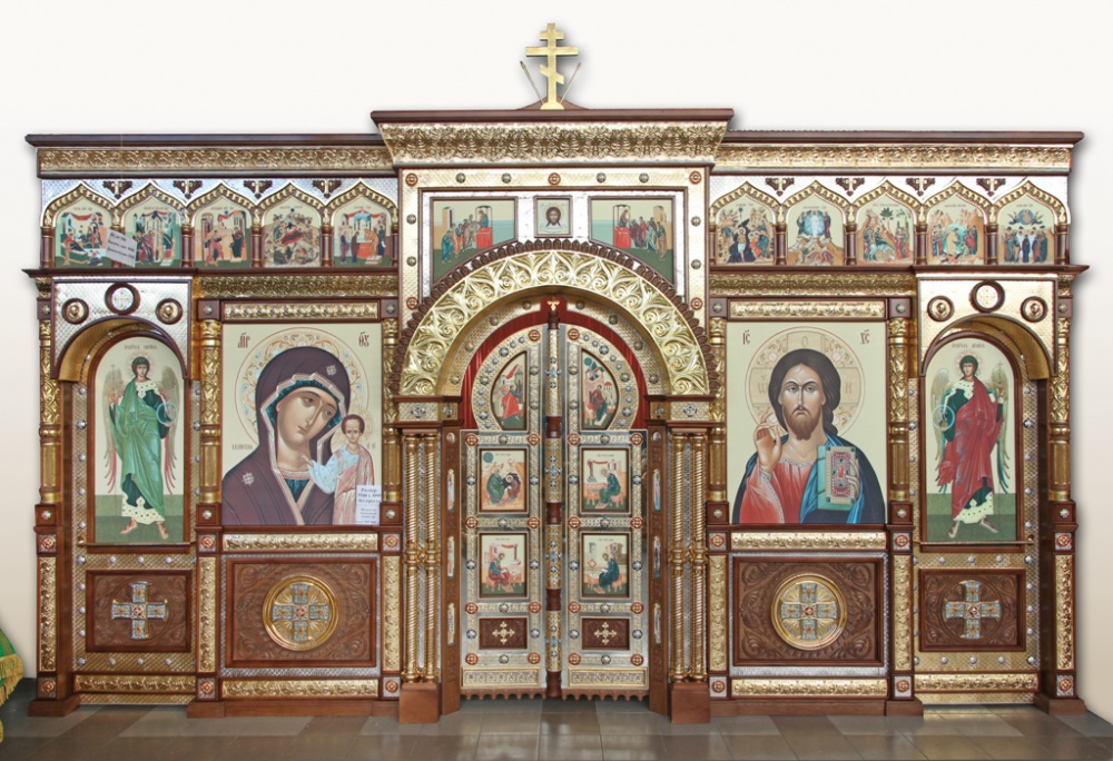 Тело иконостаса - резьба по дереву твердых пород, покраска морение,лак, сусальное золочение; басма - золочение, никилирование ; иконы - фотопечать. Размер иконостаса на фотографии: ширина - 5,85 м, высота до креста - 3,25 м.