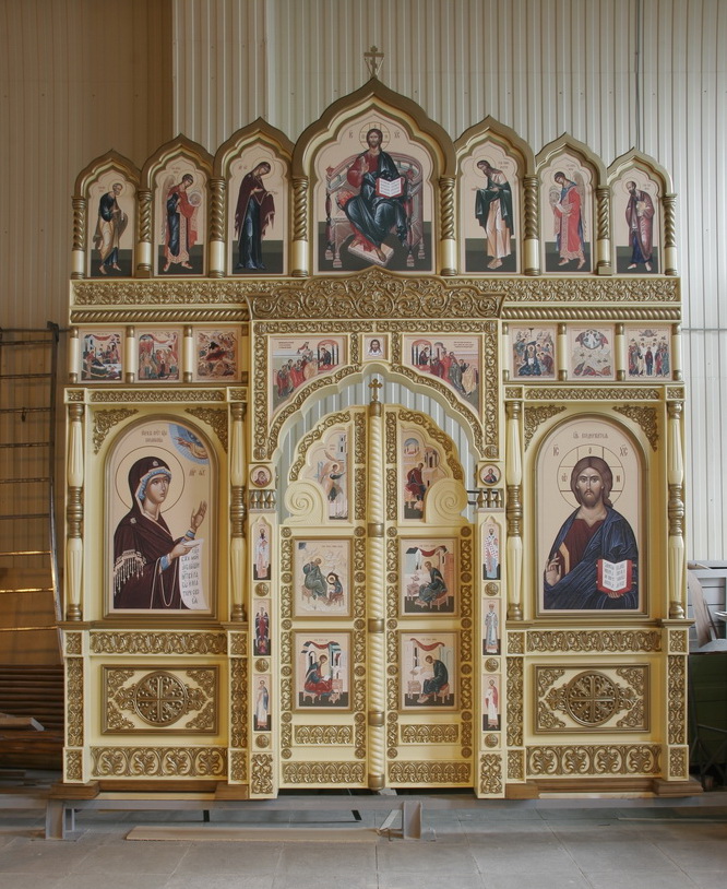 Иконостас на фото: тело иконостаса : каркас - дерево, резьба , бронзовая эмаль; иконы - фотопечать на канвасе (холст)