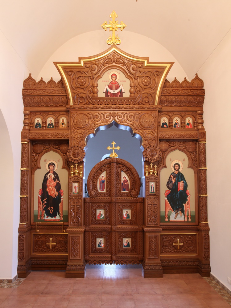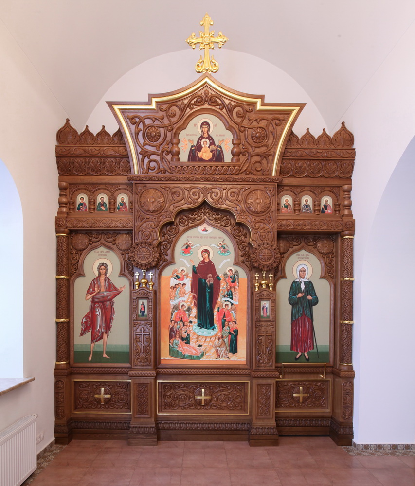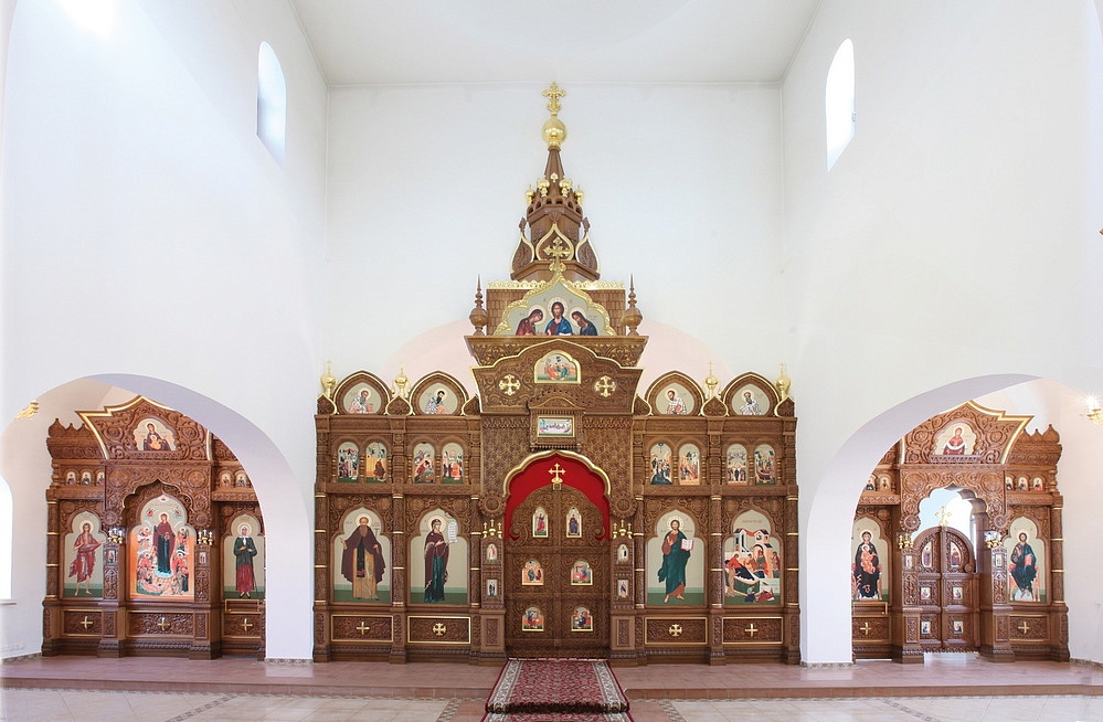 Тело иконостаса : резьба по дереву, лак,частичное сусальное золочение; иконы - фотопечать на канвасе (холст) Материал- дуб.