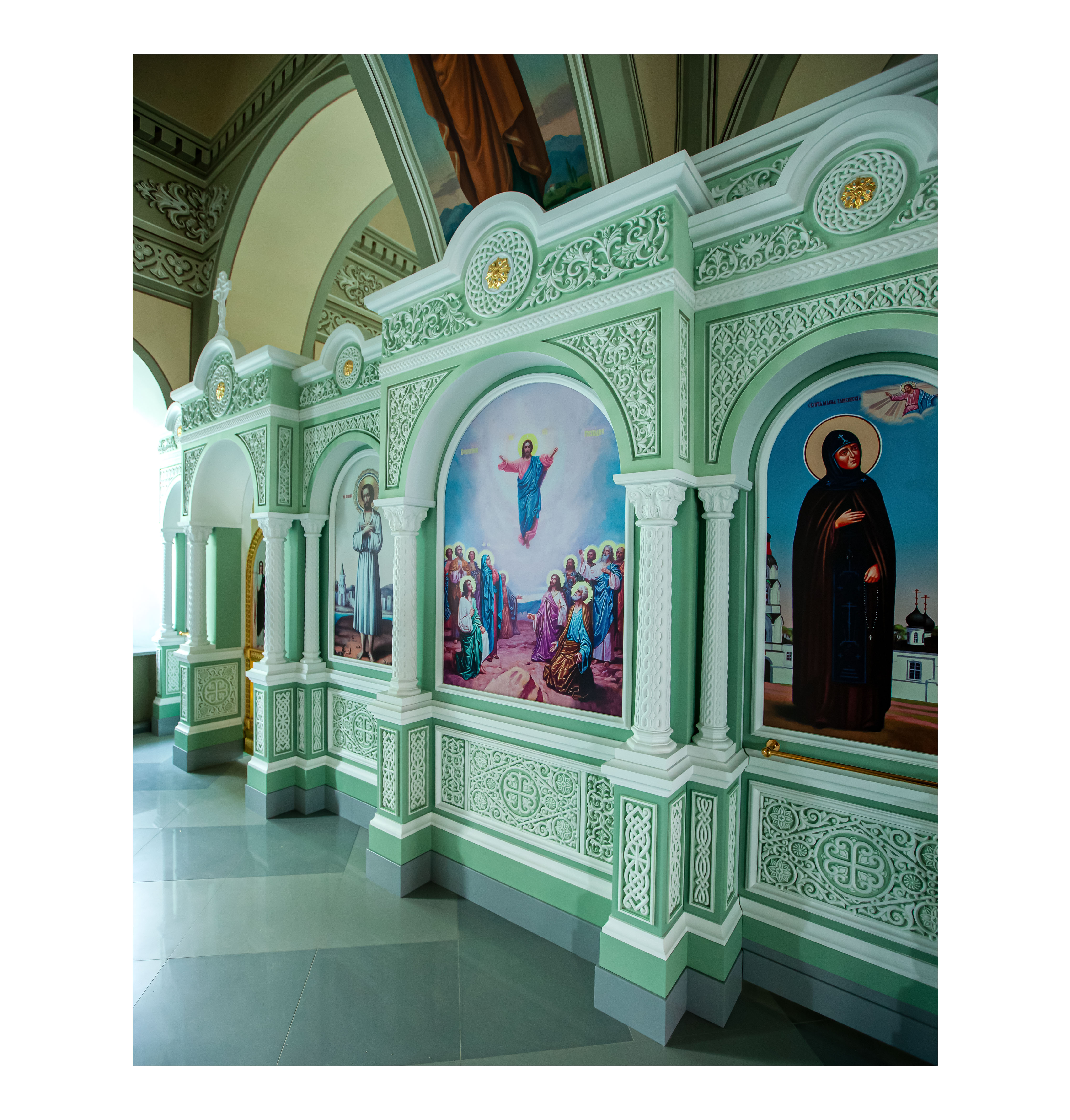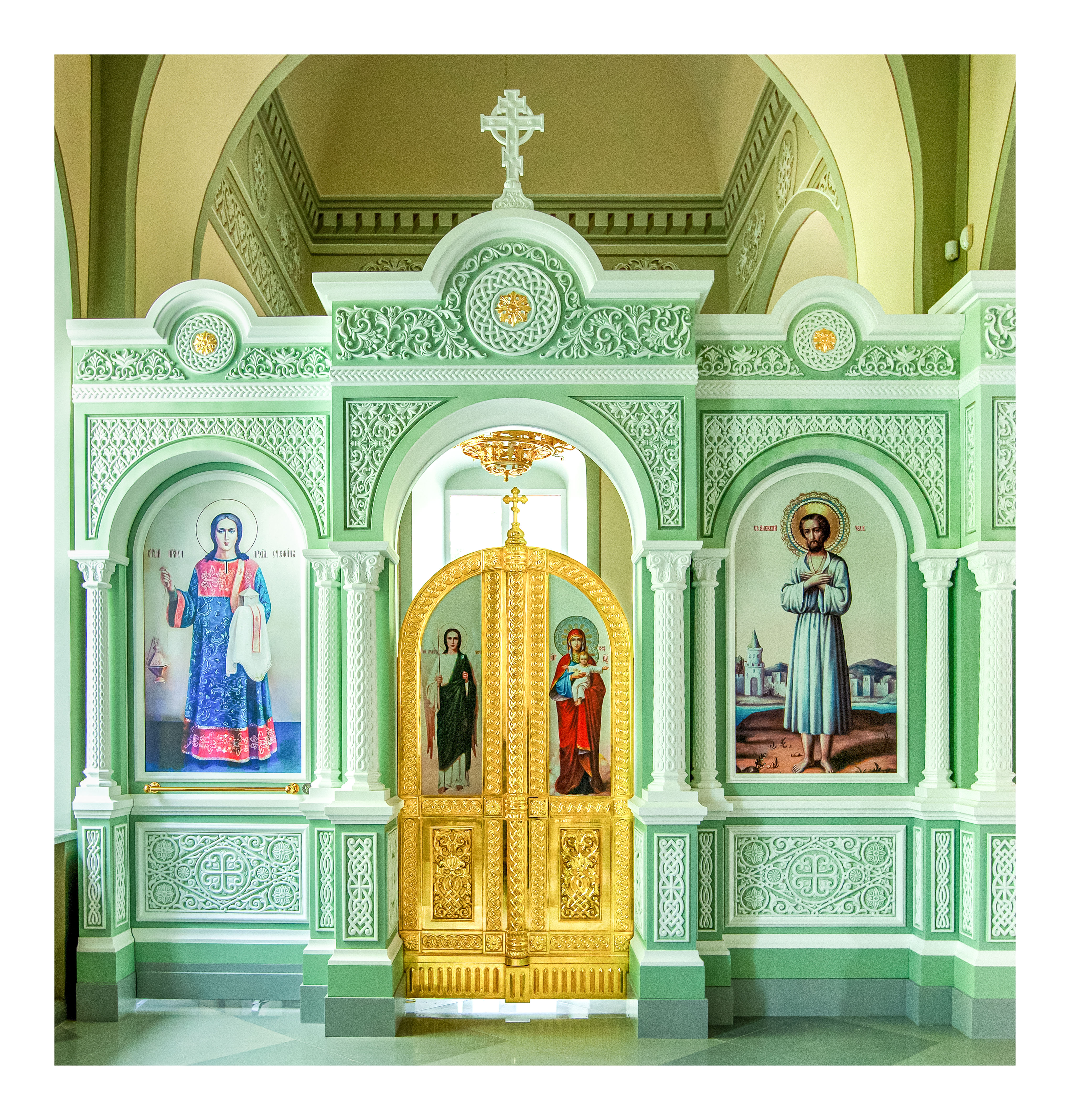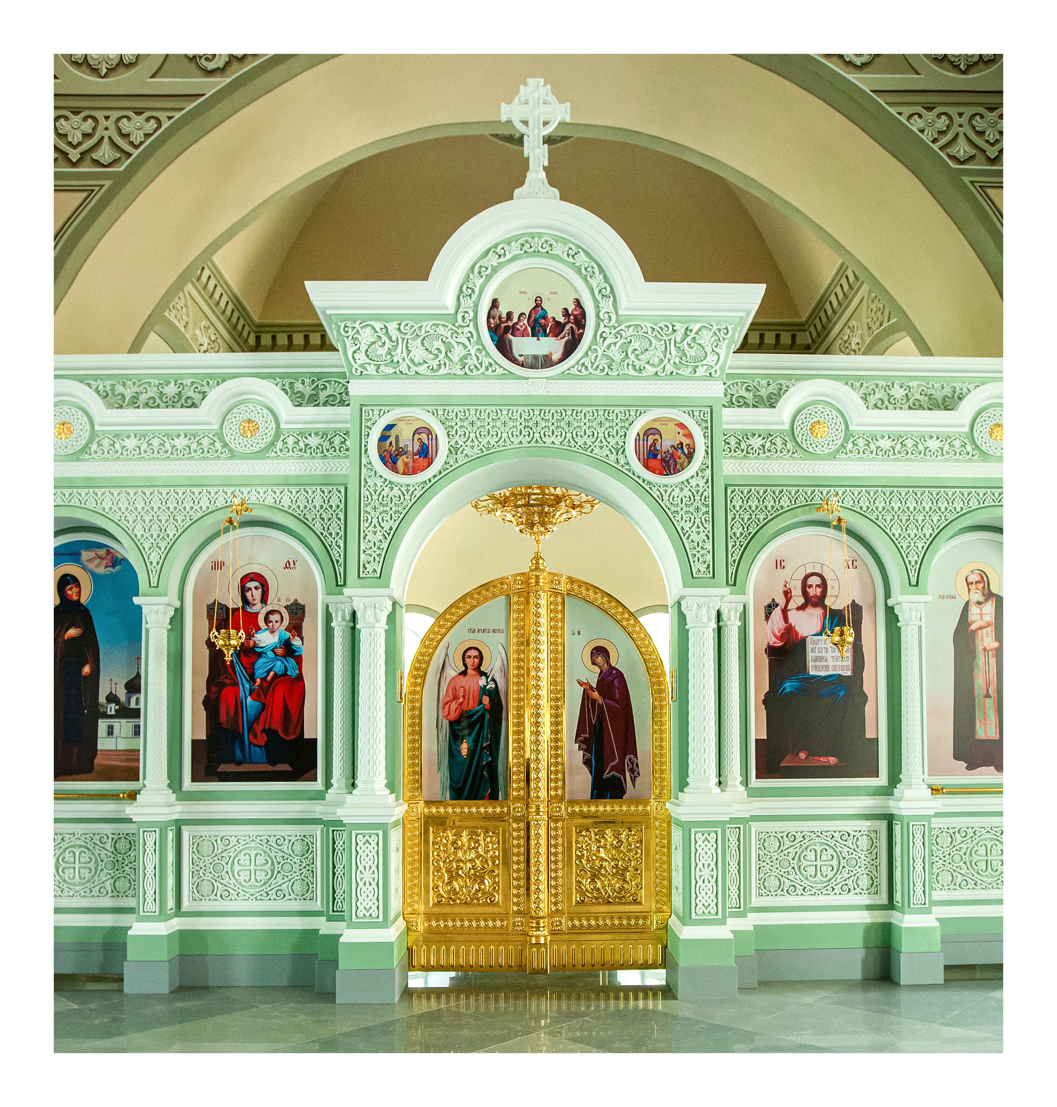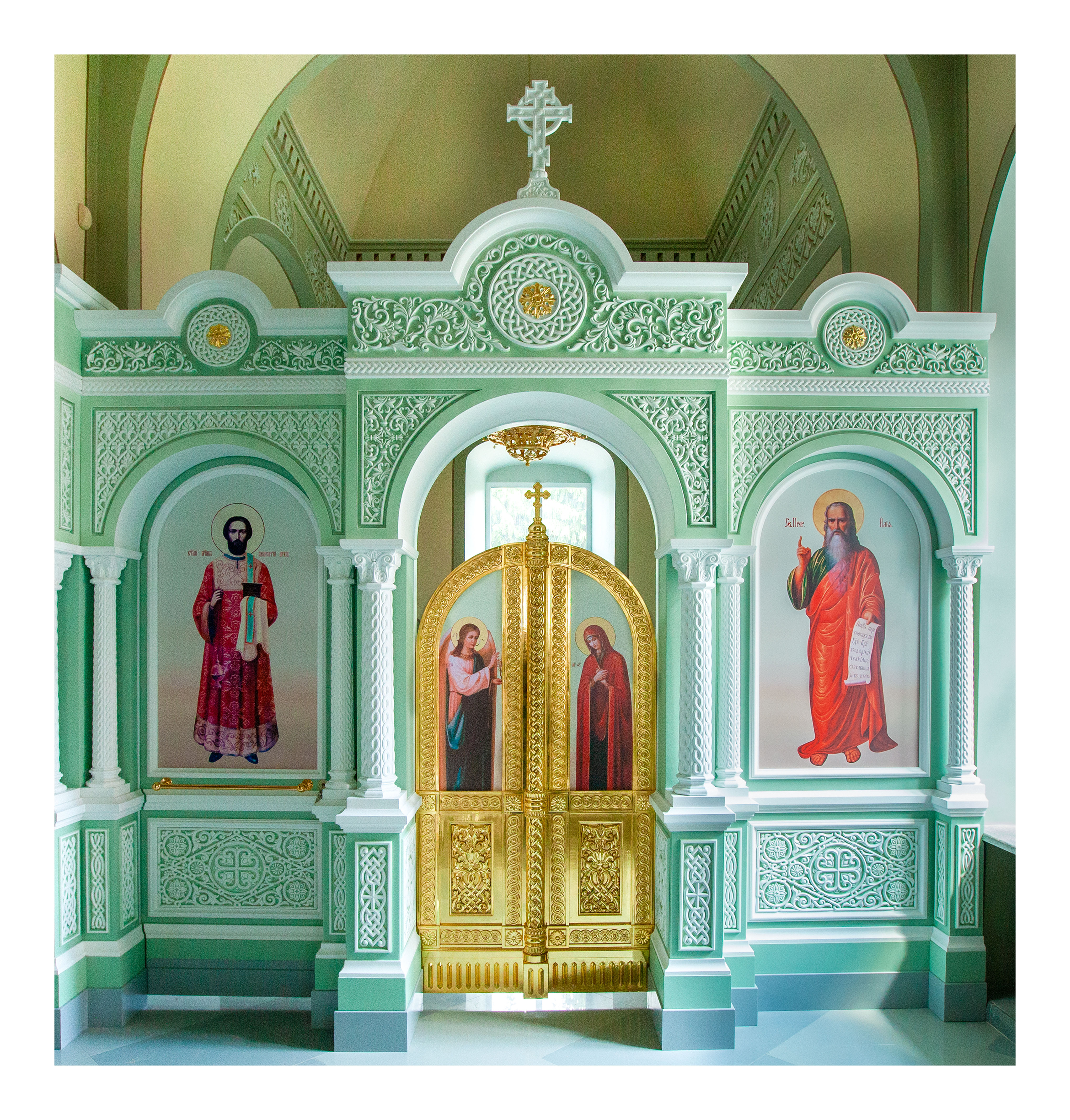 Одноярусный иконостас спроектирован в Византийском стиле каменных иконостасов, содержит характерные стилю резные элементы и общий архитектурный строй с выступающими ризолитами порталов Царских Врат и подсводных киотов. Изготовлен иконостас из твердых пород древесины и окрашен эмалью с применением техники патинирования. Створки Царских Врат покрыты сусальным золотом.