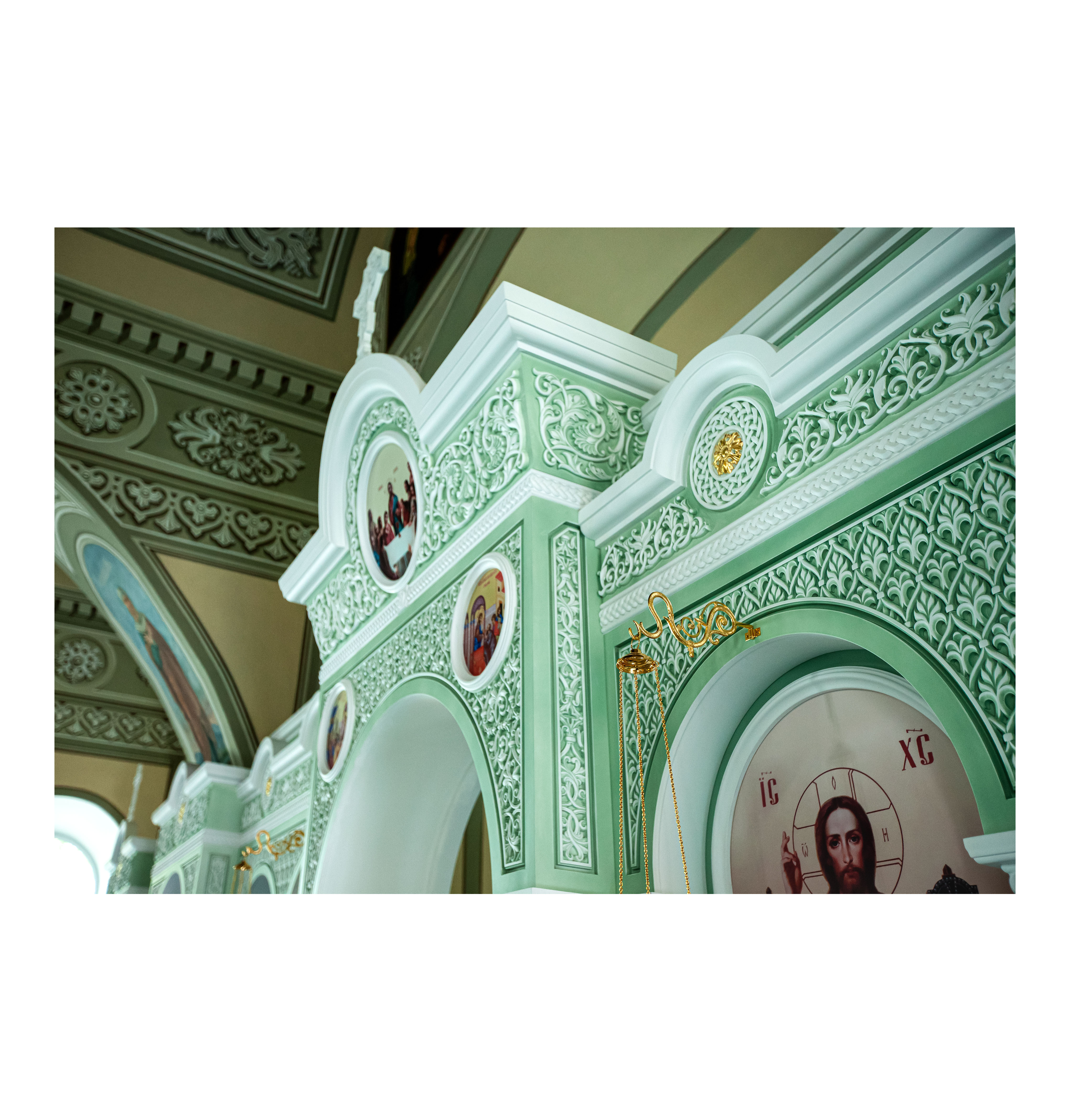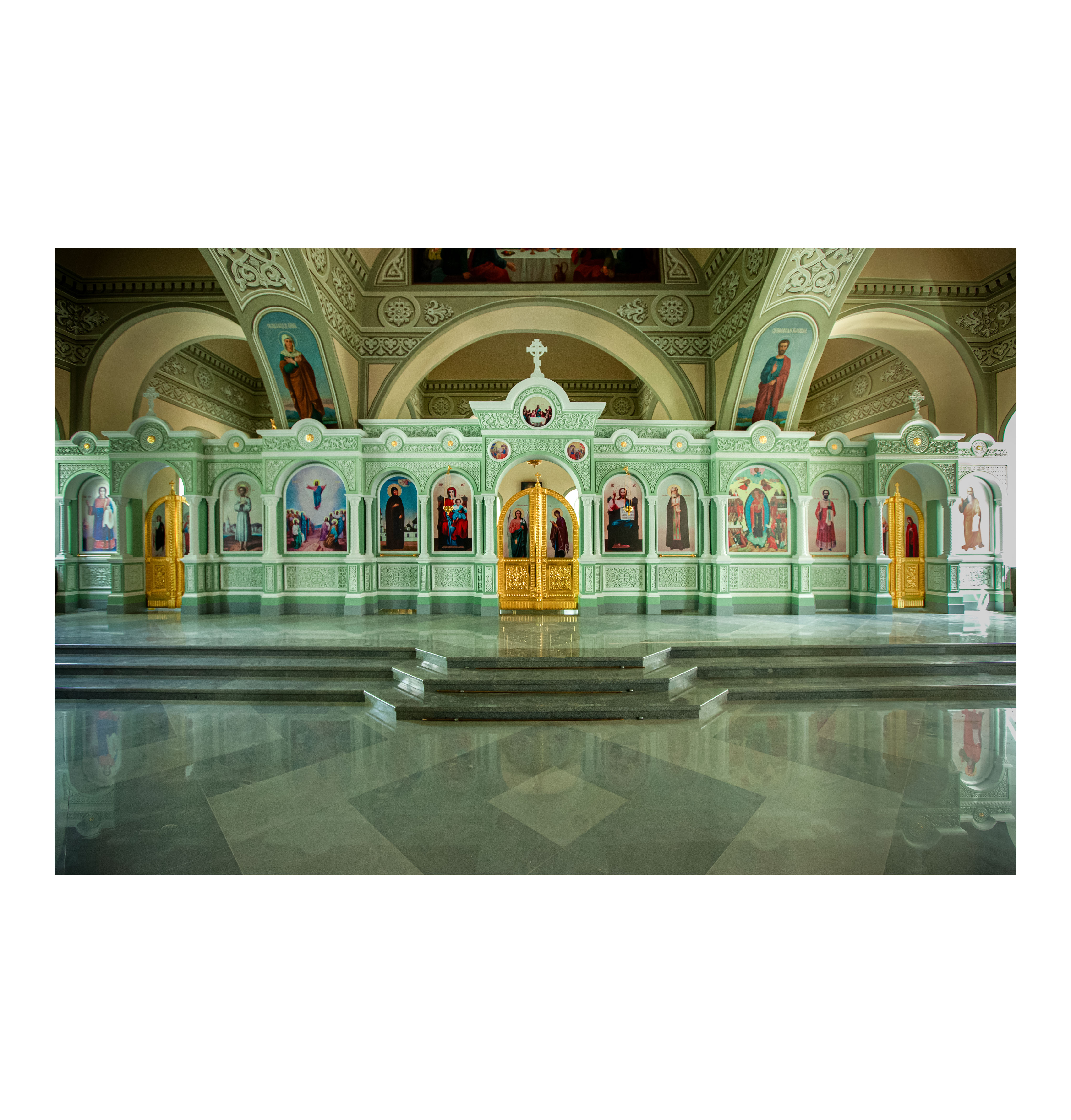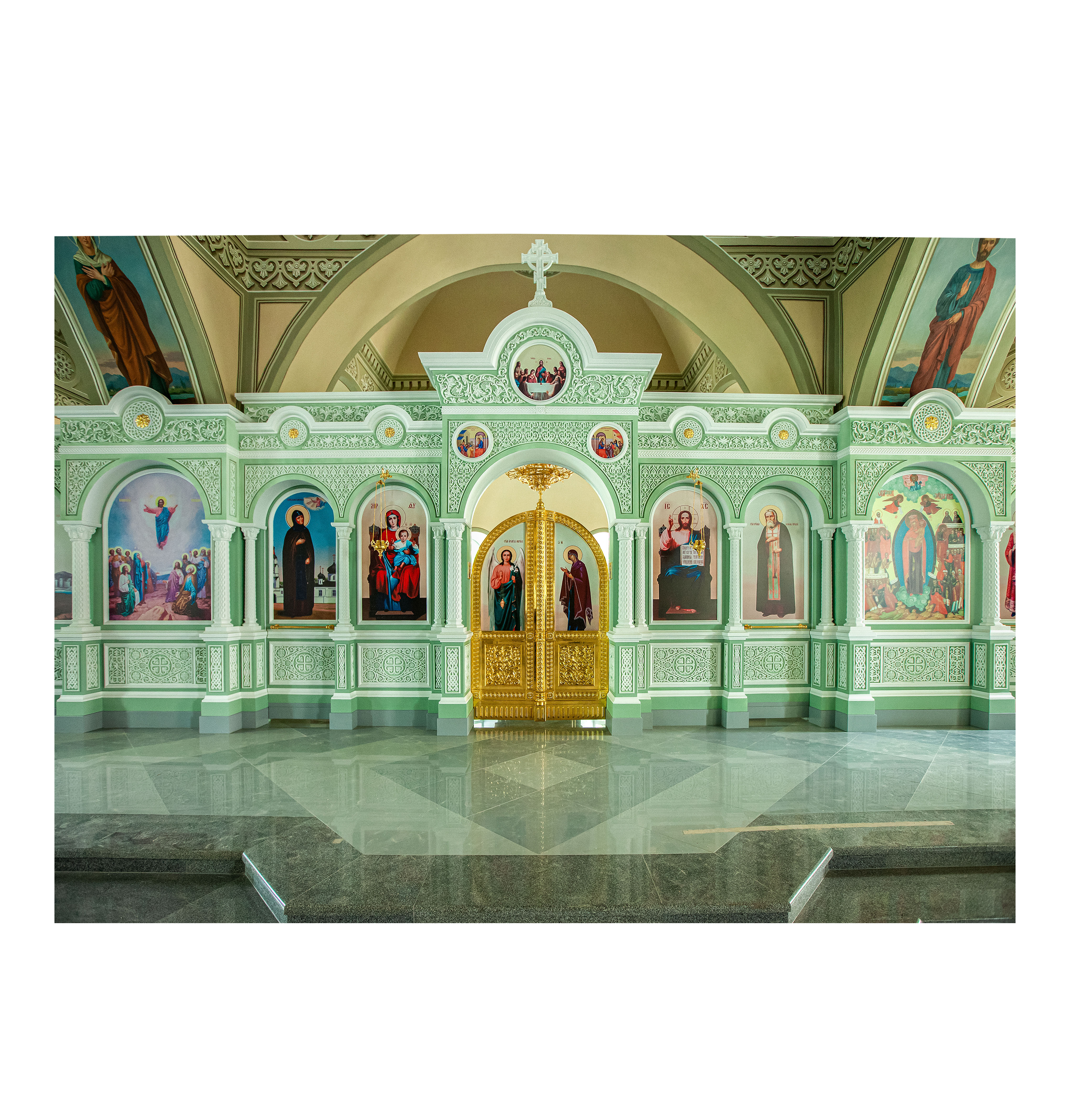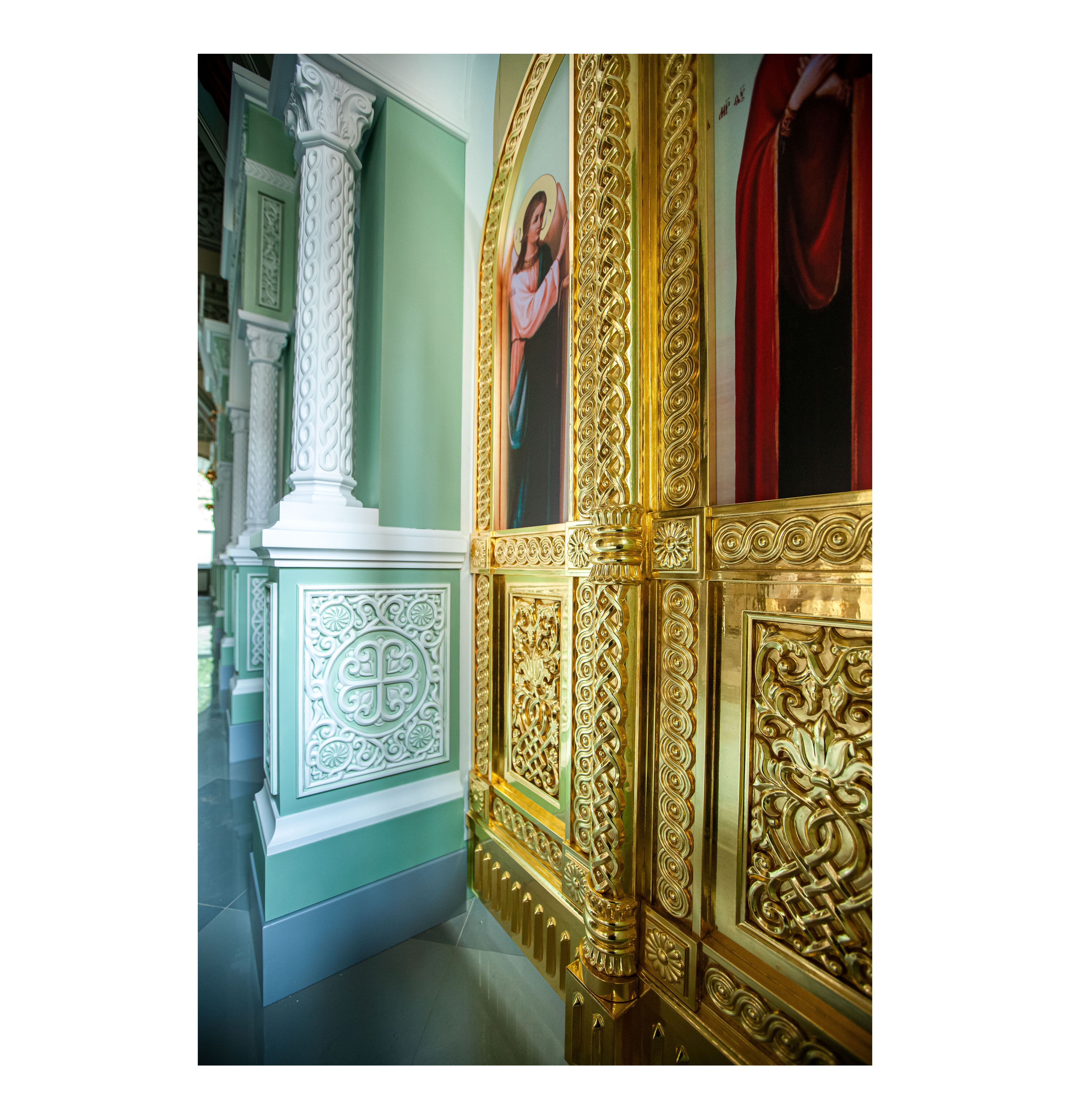 Одноярусный иконостас спроектирован в Византийском стиле каменных иконостасов, содержит характерные стилю резные элементы и общий архитектурный строй с выступающими ризолитами порталов Царских Врат и подсводных киотов. Изготовлен иконостас из твердых пород древесины и окрашен эмалью с применением техники патинирования. Створки Царских Врат покрыты сусальным золотом.
