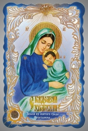 Икона в жесткой ламинации 8х11 с оборотом, тиснение, высечка, частица земли Рождество Христово 46