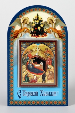 Икона в жесткой ламинации 8х11 с оборотом, тиснение, высечка, частица земли Рождество Христово 44