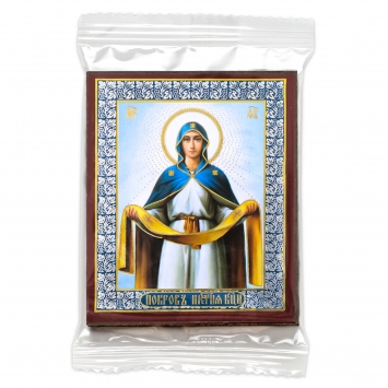 Икона на деревянном планшете 6х9 двойное тиснение, аннотация, упаковка Покров (поясной)