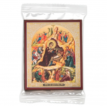 Икона в жесткой ламинации 8х11 с оборотом, тиснение, высечка, частица земли Рождество Христово 54