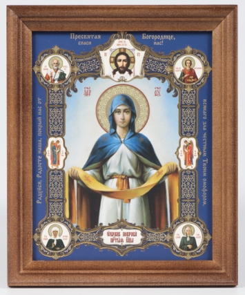 Икона в деревянной рамке 13х18 конгрев, плёнка (без стекла) Покров (с клеймами)