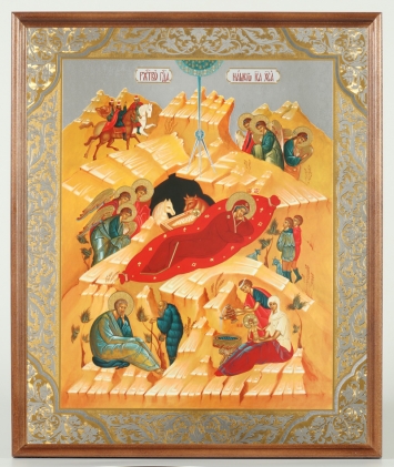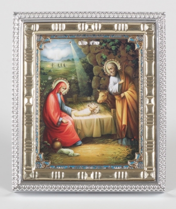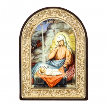 Икона в киоте 18х24 фигурный, темпера, риза-рамка объемная, открытая, золочёная, никелирование Рождество Христово 2