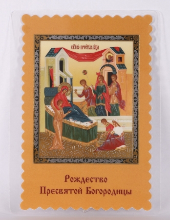 Икона в жесткой ламинации 8х11 с оборотом, двойное тиснение, высечка Рождество Богородицы