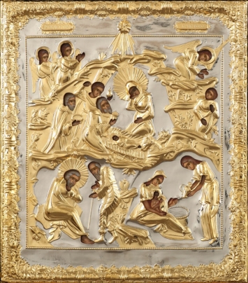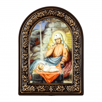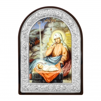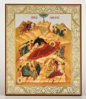 Икона в киоте 18х24 фигурный, темпера №9, риза-рамка объемная, открытая, золочёная, никелирование Рождество Христово 2