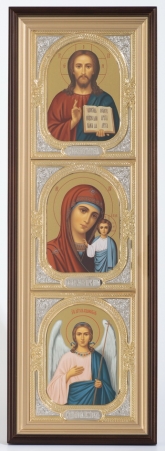 Икона в киоте 20х70 сложный, темпера, риза-рамка объемная, открытая, золочение, никелирование Спаситель 1- Казанская БМ 1- Ангел Хранитель 1