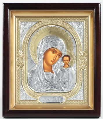 Икона в киоте 18х24 сложный, темпера, риза объёмная №1 Казанская БМ