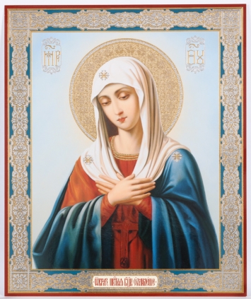 Икона в киоте 22х26 сложный, тройное тиснение, венчик золоченый Владимирская БМ