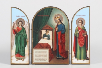 Складни деревянные 18х24 трехстворчатые, двойное тиснение, арочные, в упаковке Ангел - Хранитель - Целительница - Пантелеимон