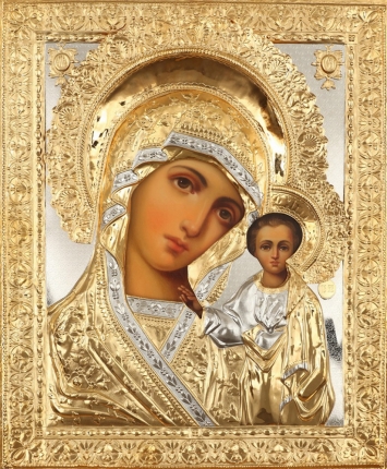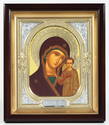 Икона в киоте 18х24 сложный, темпера, венчик, риза-рамка №1 Казанская БМ