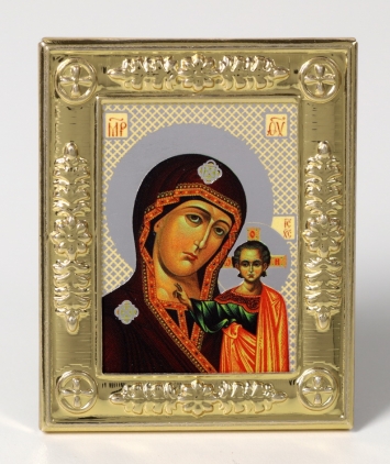 Икона в металлической рамке 4х5 тиснение, на липкой ленте Казанская БМ