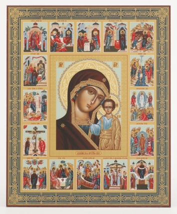 Икона на оргалите №1 30х40 тиснение Казанская БМ (с житием)