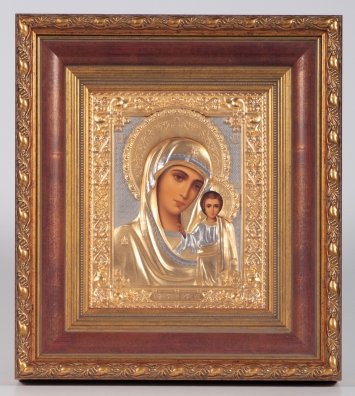 Икона в киоте 18х24 фигурный, темпера №8, риза-рамка объемная, открытая, золочёная, никелирование Казанская БМ 1