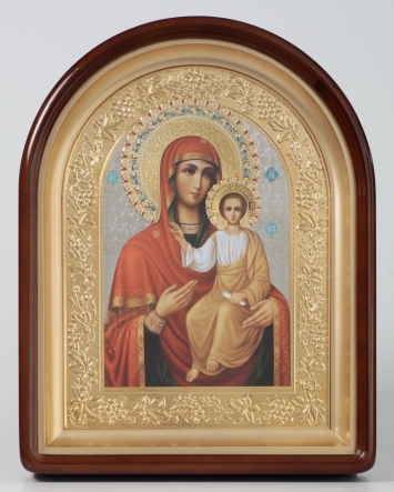 Икона в киоте 24х30 сложный, арочный, фото, риза объемная, открытая, золочение, эмаль Смоленская БМ