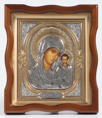 Икона в киоте 18х24 фигурный №4 темпера, риза объёмная, никель, золочение Казанская БМ