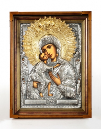 Икона в киоте 18х24 фигурный, темпера, риза-рамка объемная, открытая, золочёная, никелирование Владимирская БМ