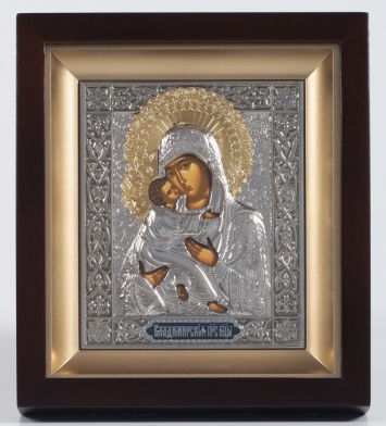Икона в киоте 11х13 фигурный №2 темпера, пластмассовый подрамник, риза никель, эмаль, золоч Владимирская БМ