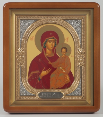 Икона в киоте 18х24 фигурный, темпера, риза-рамка объемная, открытая, золочёная, никелирование Смоленская БМ