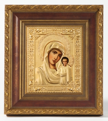 Икона живописная в киоте 18х24 масло, риза №241, матовое глянцевое золочение, киот №22 Казанская БМ