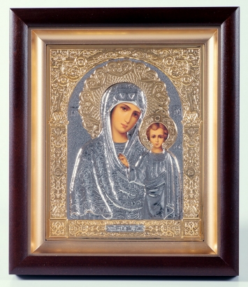 Икона в киоте 15х19 сложный, темпера, риза объёмная, никель, золочение Казанская БМ 1