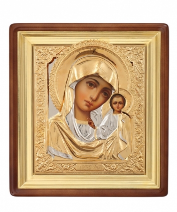 Икона в киоте 18х24 фигурный, темпера №8, риза-рамка объемная, открытая, золочёная, никелирование Казанская БМ