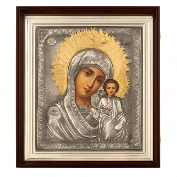 Икона живописная в киоте 30х40 масло, риза №180, черненое серебрение, киот №1 Казанская БМ