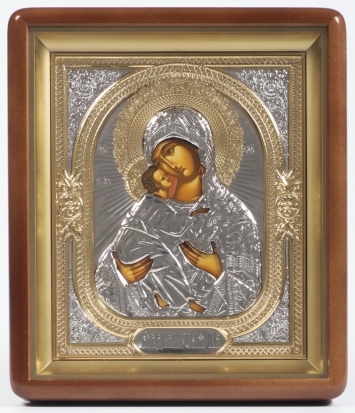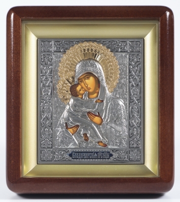 Икона в киоте 18х24 фигурный, темпера, риза объёмная, никель, золочение Владимирская БМ