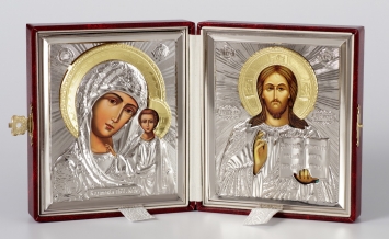 Складни живописные в футляре 24х30 масло, ризы №1, №24 открытые, черненое серебрение, эмаль (бархат) Спаситель-Казанская БМ