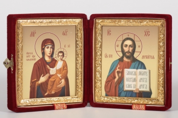 Икона в жесткой ламинации складень-двойник 7х12 двойное тиснение Спаситель-Казанская БМ 14