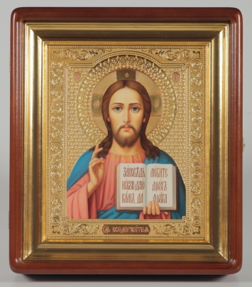 Икона в киоте 24х30 фигурный, темпера, риза объемная, открытая, золочение, эмаль Спаситель