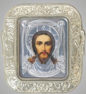 Икона в киоте 11х13 фигурный №2 темпера, пластмассовый подрамник, риза никель, эмаль, золоч Спаситель