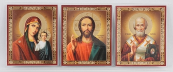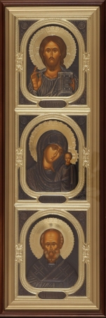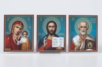 Икона в жесткой ламинации складень-тройник 7х18 двойное тиснение Спаситель-Казанская БМ-Н.Чудотворец 34