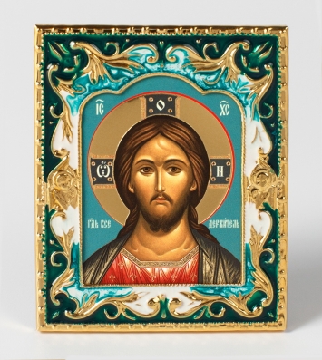 Икона в киоте 24х30 сложный, арочный, фото, риза объемная, открытая, золочение, эмаль Спаситель