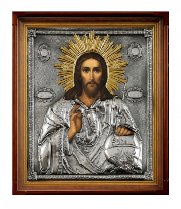 Икона живописная в киоте 50х60 масло, риза №71, черненое серебрение, киот №21 Спаситель